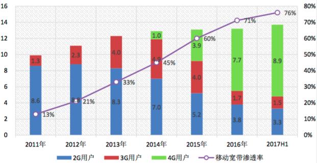 2011-2017 年移動電話用戶結(jié)構(gòu)變化情況