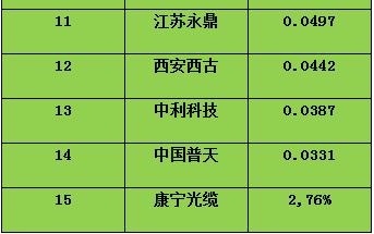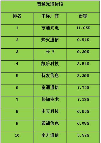 光纜部分:其中普通光纜預(yù)計(jì)采購8874.5萬芯公里,307.01萬皮長公里;中標(biāo)廠商達(dá)15家,其中亨通光電仍以11.05%的份額位列第一,烽火通信和長飛緊隨其后。各家廠商具體份額如下: