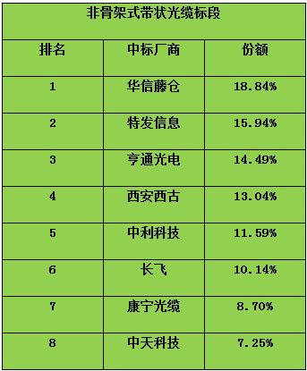 骨架式帶狀光纜:預(yù)計(jì)采購314.81萬芯公里,1.58萬皮長公里。共三家企業(yè)中標(biāo):亨通光電以40.00%份額位列第一、長飛中標(biāo)份額為32.00%、富通通信中標(biāo)份額28.00%。