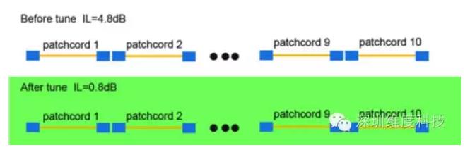 實(shí)驗(yàn)時(shí)沒(méi)有經(jīng)過(guò)調(diào)芯的10條光纖連接器串聯(lián)的接入損耗IL=4.8dB,每個(gè)光纖連接器經(jīng)過(guò)調(diào)芯后再串聯(lián)的接入損耗IL=0.8dB