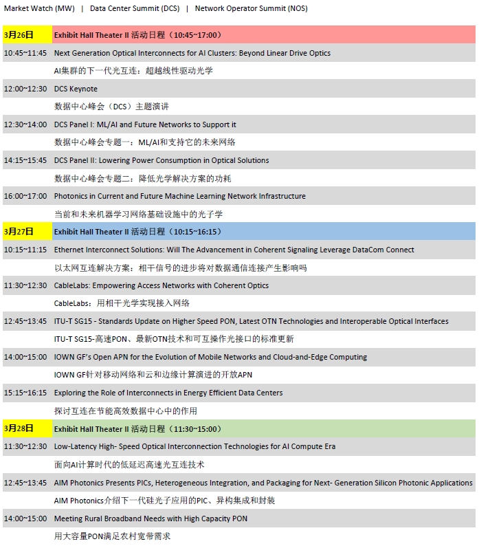 OFC在展場設(shè)置了三個會場:Exhibit Hall Theater I、Exhibit Hall Theater II、Exhibit Hall Theater III,每個會場都有為期三天(3.26-3.28)的會議活動。ICC訊石特意整理了這三個會議廳三天的會議日程,內(nèi)容包括會議主題、論壇嘉賓以及論壇內(nèi)容介紹等,感興趣的朋友們可以參考該日程,選擇自己感興趣的主題,聽會觀展兩不誤。