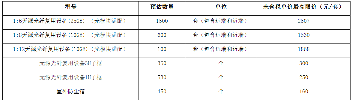 ICC訊 (編輯:Nicole)寧夏移動(dòng)啟動(dòng)2020年-2021年光纖復(fù)用設(shè)備集采項(xiàng)目(招標(biāo)編號(hào):200000000016989),擬采購(gòu)無(wú)源光纖復(fù)用設(shè)備共3530套,主要包括:1:6無(wú)源光纖復(fù)用設(shè)備(25GE)(光模塊滿配)1500對(duì)端,1:8無(wú)源光纖復(fù)用設(shè)備(10GE)(光模塊滿配)600對(duì)端,1:12無(wú)源光纖復(fù)用設(shè)備(10GE)(光模塊滿配)100對(duì)端,無(wú)源光纖復(fù)用設(shè)備3U子框350個(gè),無(wú)源光纖復(fù)用設(shè)備1U子框530個(gè),室外防塵箱450個(gè)。