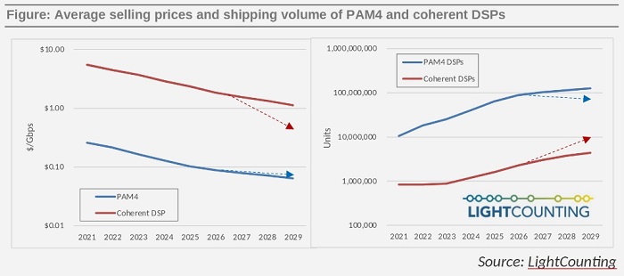 LC預(yù)計更多的供應(yīng)商將進入PAM4和相干DSP市場,競爭加劇,從而降低了售價。一些中國公司現(xiàn)在開始提供PAM4 DSP,其中一些公司可能在未來開發(fā)相干的DSP。中國制造商進入光收發(fā)器和器件市場導致銷售價格大幅下降。這一趨勢也可能在DSP細分市場重演,導致PAM4和相干DSP的價格在2027-2029年大幅下降。