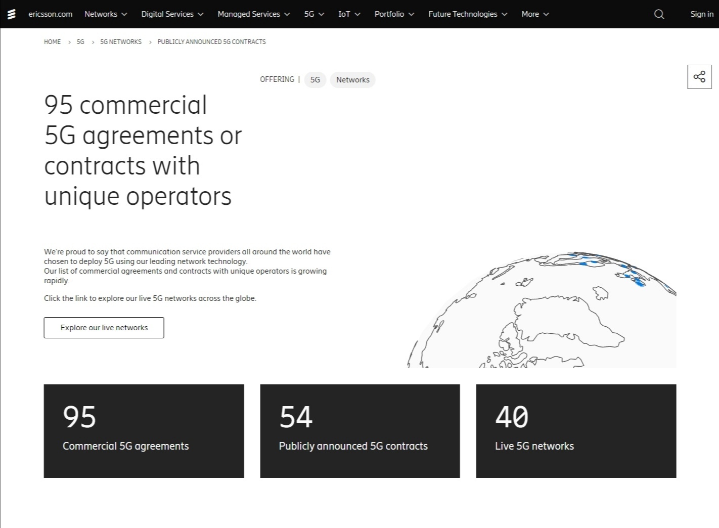 ICC訊 愛立信官網(wǎng)數(shù)據(jù)顯示,目前愛立信已經(jīng)斬獲95個(gè)5G商用合同,其中愛立信已經(jīng)與54家運(yùn)營(yíng)商客戶達(dá)成可公示的5G商用合同,目前在23個(gè)國(guó)家為40個(gè)已經(jīng)正式運(yùn)行的5G商用網(wǎng)絡(luò)提供設(shè)備。