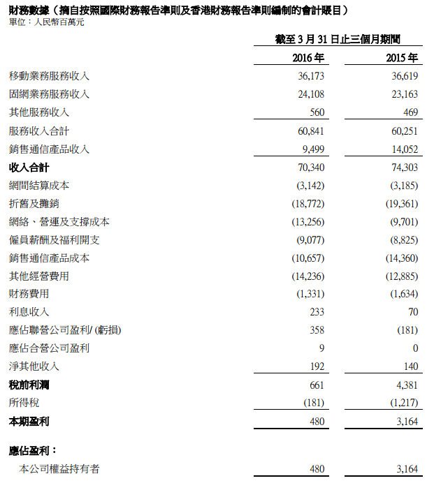 ICCSZ訊 中國聯(lián)通21日發(fā)布2016年第一季度業(yè)績財(cái)報(bào)。報(bào)告顯示,一季度實(shí)現(xiàn)營收703.4億元,同比下降5.3%,環(huán)比增長8%;凈利僅4.8億元,同比下降84.8%。