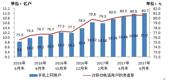 圖5 2016-2017年6月手機(jī)上網(wǎng)用戶和對(duì)移動(dòng)電話用戶滲透率情況