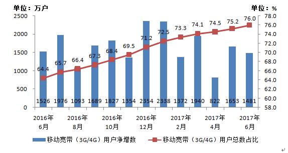 圖3 2016-2017年6月移動(dòng)寬帶用戶當(dāng)月凈增數(shù)和總數(shù)占比情況