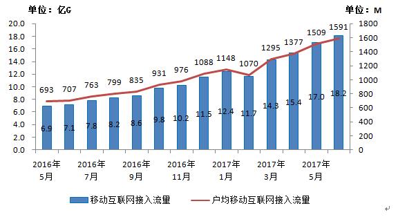 圖8 2016-2017年6月當(dāng)月移動(dòng)互聯(lián)網(wǎng)接入流量和戶均流量比較