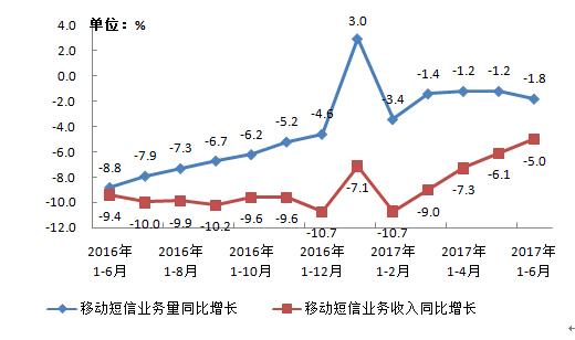 圖7 2016-2017年6月移動(dòng)短信業(yè)務(wù)量和收入同比增長(zhǎng)情況