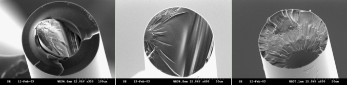 圖2光纖在不同應(yīng)力下的斷裂端面圖(應(yīng)力從左到右變小)