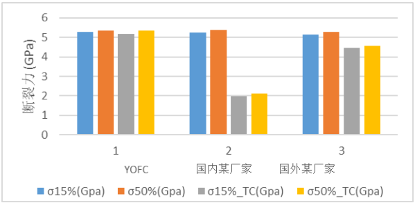 圖4 老化前后彎曲不敏感光纖的斷裂力測(cè)試數(shù)據(jù)(TC表示老化)