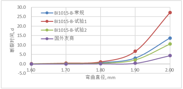 圖5 極小彎曲半徑下,國(guó)內(nèi)外彎曲不敏感光纖斷裂時(shí)間對(duì)比