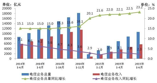 圖1 2014-2015年6月電信業(yè)務總量與業(yè)務收入發(fā)展情況
