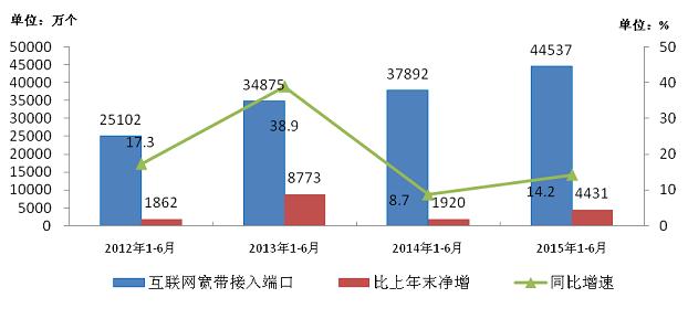 圖10 2012-2015年1-6月互聯(lián)網(wǎng)寬帶接入端口發(fā)展情況