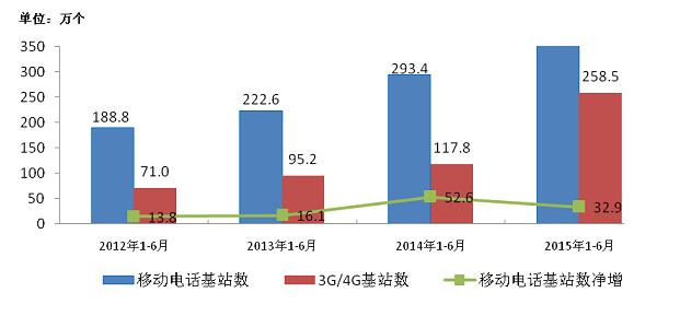圖11 2012-2015年1-6月移動電話基站數(shù)發(fā)展情況