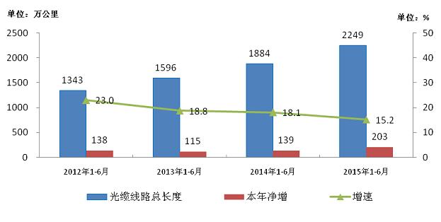 圖12 2012-2015年1-6月光纜線路總長度發(fā)展情況