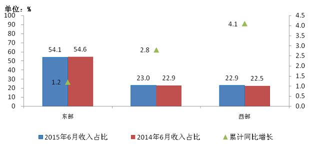 圖13 2015年6月東、中、西部電信主營業(yè)務收入同期比較