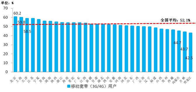 6月,東、中、西部地區(qū)移動寬帶(3G/4G)用戶分別比上年末凈增5102.3、2073.8、1961.9萬戶,東部地區(qū)的凈增用戶超過中西部地區(qū)凈增之和,但移動寬帶(3G/4G)用戶滲透率相差較小,東、中、西部地區(qū)移動寬帶(3G/4G)用戶滲透率均超過50%,達53.7%、50.2%和50.9%。各省間移動寬帶(3G/4G)用戶占比差異依然較大,占比高于50%的省份超過三分之二,其中北京、上海、天津、江蘇和寧夏分別居全國前五位,占比均超過57%。占比低于45%的省份有黑龍江、吉林和內(nèi)蒙古,其中黑龍江占比全國最低,僅為42.5%。