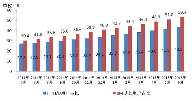 圖3 2014-2015年6月光纖接入FTTH/O和8Mbps及以上寬帶用戶占比情況