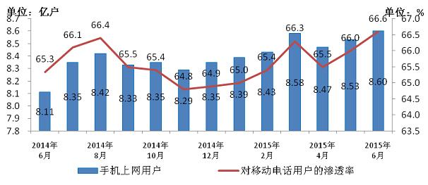 圖4 2014-2015年6月手機上網(wǎng)用戶和對移動電話用戶滲透率情況