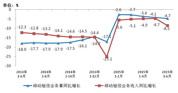 圖6 2014-2015年6月移動短信業(yè)務量和移動短信收入同比增長情況
