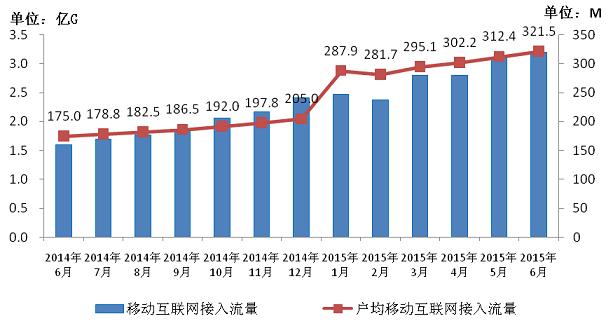 圖7 2014-2015年6月移動互聯(lián)網(wǎng)接入流量和戶均流量比較