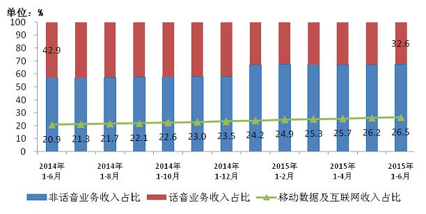 圖9 2014年-2105年6月話音、非話音、移動數(shù)據(jù)及互聯(lián)網(wǎng)收入占比情況