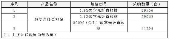 其中,1.8G數(shù)字光纖直放站采購數(shù)量為29566臺,2.1G數(shù)字光纖直放站采購數(shù)量為29063臺,800M(C/L)數(shù)字光纖直放站采購數(shù)量為41294臺。數(shù)量需以實際采購為準。