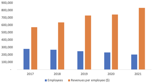 一項(xiàng)指標(biāo)已經(jīng)急劇上升。早在 2017 年,AT&T 的每位員工年收入約為 575,000 美元。在2021年的第四季度更新之后,它現(xiàn)在超過(guò) 830,000 美元。