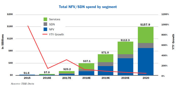 一個更大膽的猜測來源于TBR,在2021年,整個NFV市場將達到1580億美元,這個市場的爆發(fā)節(jié)點將從AT&T投資的SDN以及NFV生態(tài)開始奏效之后迅速展開。TBR電信產(chǎn)業(yè)高級分析師Chris Antlitz認為,目前越來越多的頂層運營商正在領(lǐng)銜NFV以及SDN的收費項目,這為整個行業(yè)生態(tài)系統(tǒng)做了正向的推動,并將持續(xù)將供應(yīng)商以及生態(tài)產(chǎn)業(yè)鏈向整個新架構(gòu)方式靠攏。NFV以及SDN的投資預(yù)測將于2017年迅速爆發(fā),屆時,更多的案例將被定義,整個產(chǎn)業(yè)的成本效益將獲得提升。這將促使固執(zhí)己見的運營商迅速跟進時代的變革,并積極追求變化,以避免自己被時代所淘汰。