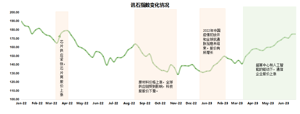 ICC訊 (編輯:Vicki)截止到6月30日,訊石統(tǒng)計(jì)的指數(shù)值為174.98,比上月的166.06增長(zhǎng)8.92。Chatgpt 為代表的 AI 應(yīng)用正在得到快速發(fā)展,算力需求快速增長(zhǎng)。促使800G光模塊、芯片需求增長(zhǎng)。運(yùn)營(yíng)商和內(nèi)容運(yùn)營(yíng)商加速算力網(wǎng)絡(luò)部署。國(guó)內(nèi)光纖光纜商迎來(lái)新一輪的集采。整體來(lái)看,訊石股指6月呈增長(zhǎng)趨勢(shì)。