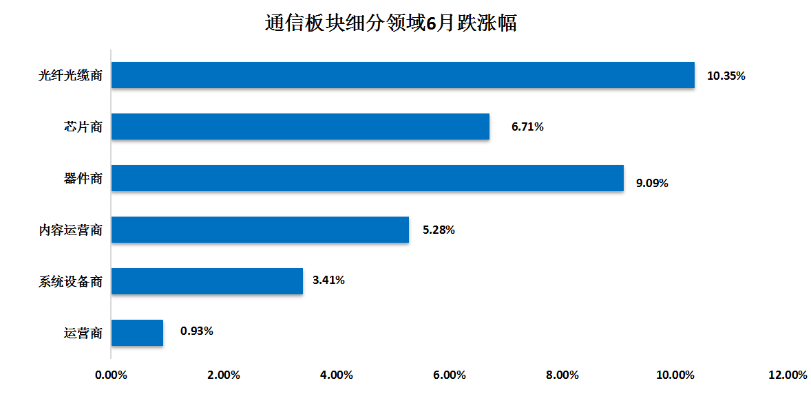 細(xì)分領(lǐng)域來(lái)看,ICC所統(tǒng)計(jì)的互聯(lián)網(wǎng)內(nèi)容運(yùn)營(yíng)商股指為120.85,相比上個(gè)月的114.79增長(zhǎng)了5.28%。為了滿足應(yīng)用和內(nèi)容增長(zhǎng)需求的云計(jì)算基礎(chǔ)設(shè)施和物聯(lián)網(wǎng)硬件終端投資,云廠商基于新應(yīng)用和新內(nèi)容增長(zhǎng),加大云計(jì)算基礎(chǔ)設(shè)施投入?;ヂ?lián)網(wǎng)內(nèi)容運(yùn)營(yíng)商本月呈增長(zhǎng)趨勢(shì)。運(yùn)營(yíng)商指數(shù)為83.43,5月底股指為82.66,增長(zhǎng)了0.93%。運(yùn)營(yíng)商加大算力網(wǎng)絡(luò)部署,本月運(yùn)營(yíng)商股指在波動(dòng)中出現(xiàn)增長(zhǎng)趨勢(shì)。設(shè)備商股指為109.55,相比上個(gè)月的105.94增長(zhǎng)3.41%。國(guó)內(nèi)運(yùn)營(yíng)商5G基站相關(guān)集采啟動(dòng),相關(guān)相關(guān)網(wǎng)絡(luò)建設(shè)投資平穩(wěn)增長(zhǎng)。國(guó)外設(shè)備商銷庫(kù)存,訂單需求平穩(wěn)。器件商股指為222.06比上月的203.56增長(zhǎng)9.09%。算力網(wǎng)絡(luò)升級(jí),給800G光模塊帶來(lái)機(jī)會(huì)。本月器件商股指與上月相比有所回升。芯片商股指為287.78,比上月增長(zhǎng)6.71%。人工智能算力網(wǎng)絡(luò)的需求增長(zhǎng)促使芯片企業(yè)股價(jià)增長(zhǎng)。光纖光纜商股指為112.3,相比上月增長(zhǎng)10.35%。數(shù)字化發(fā)展加速,光纖光纜需求旺盛。根據(jù) CRU 報(bào)告未來(lái) 5 年光纜年復(fù)合增長(zhǎng)率在4%,全球光纜耗纖2024年超過(guò)6 億芯。