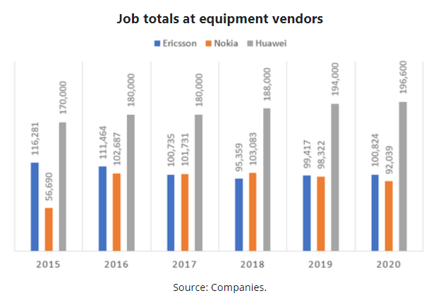 然而,兩家公司的研發(fā)投資與中國華為相比都相形見絀。華為尚未公布2020年的年度數(shù)據(jù),但去年曾承諾在研發(fā)上投入高達200億美元。另一方面,華為最新的勞動力規(guī)模數(shù)據(jù)令西方人擔憂。華為稱,盡管受到了來自美國制裁和歐洲政府禁令的所有壓力,但公司員工總數(shù)已從2017年底的18萬人增至去年12月底的約19.66萬人。