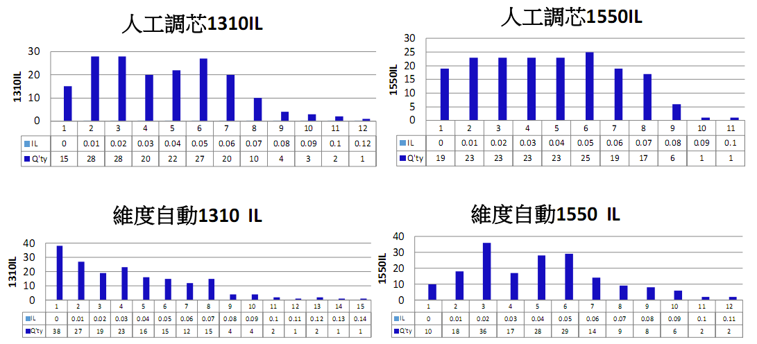 使用人工調(diào)芯與維度自動機臺,各選10條跳線進行調(diào)K後互配測試IL,