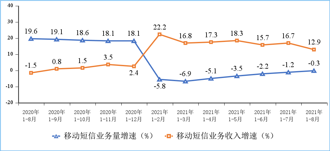 圖8 2020-2021年1-8月份移動短信業(yè)務(wù)量和收入同比增長情況