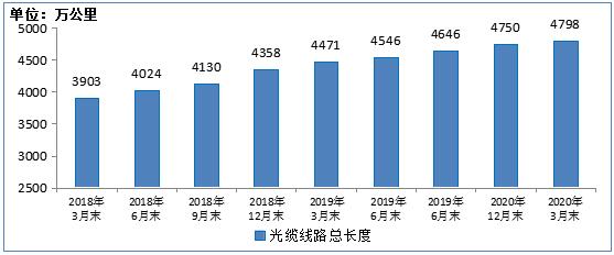 2018-2020年3月末光纜線路總長度發(fā)展情況