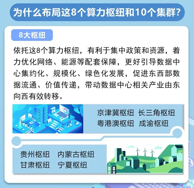 ICC訊 日前,國家發(fā)改委、中央網(wǎng)信辦、工信部和國家能源局聯(lián)合印發(fā)通知,同意在京津冀、長三角、粵港澳大灣區(qū)、成渝、內(nèi)蒙古、貴州、甘肅、寧夏等8地啟動建設國家算力樞紐節(jié)點,并規(guī)劃了10個國家數(shù)據(jù)中心集群。至此,全國一體化大數(shù)據(jù)中心體系完成總體布局設計,“東數(shù)西算”工程正式全面啟動。