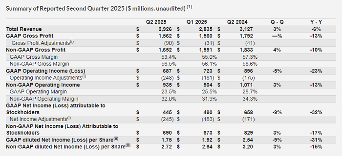 第二季度,NXP的總營收為29.3億美元,較去年同期下降6%。GAAP毛利潤為15.62億美元,GAAP毛利率為53.4%,GAAP營業(yè)利潤為6.87億美元,營業(yè)利潤率為23.5%。GAAP攤薄后每股收益為1.75美元,同比下降31%。非GAAP毛利潤為16.52億美元,毛利率為56.5%,非GAAP營業(yè)利潤為9.35億美元,營業(yè)利潤率為32.0%,非GAAP攤薄后每股收益為2.72美元,同比下降15%。