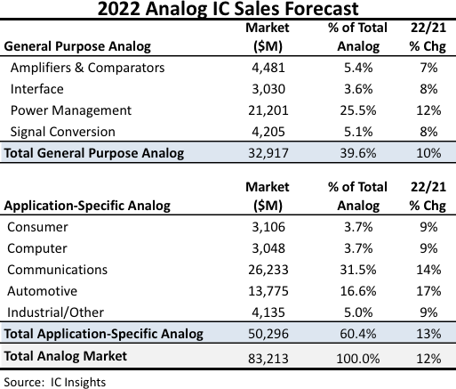 而電源管理IC將是2022年占比第二大的類比IC應(yīng)用市場,其有助于管理能源使用,控制裝置溫度并延長電池使用壽命,借此優(yōu)化手機、筆電與其他行動裝置的行動通訊及電池系統(tǒng),同時管理步進馬達(Stepper motor)、通訊介面與背光顯示等功能。