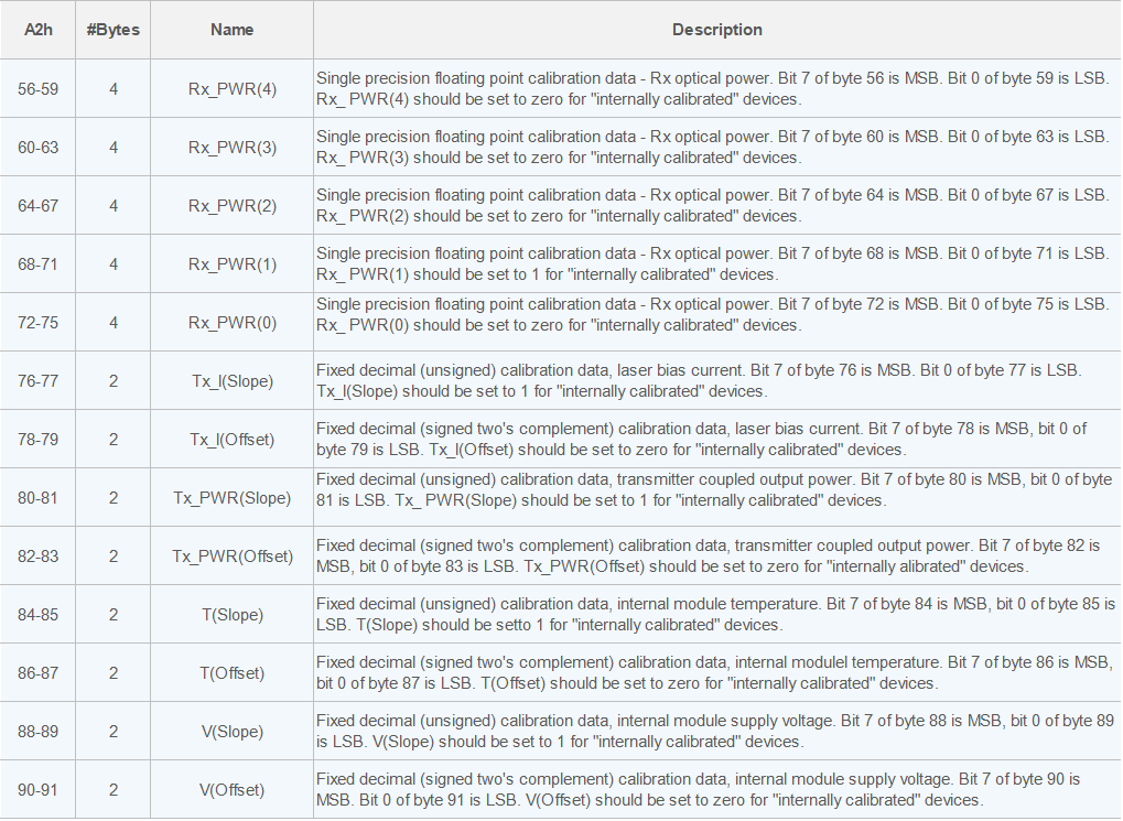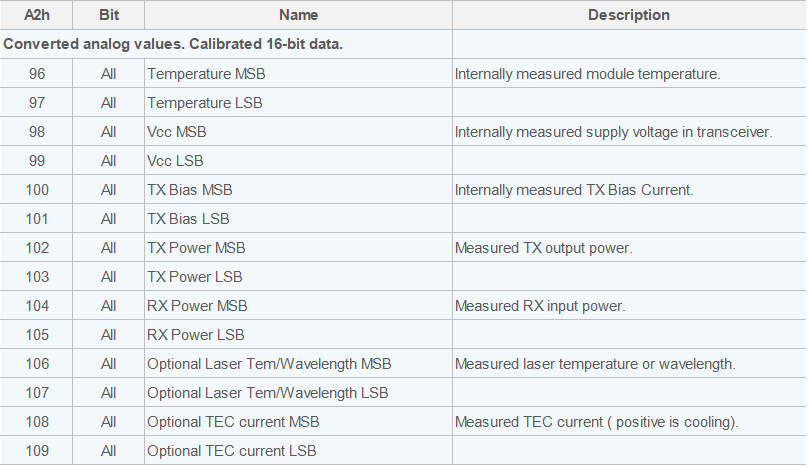 ·數(shù)字實(shí)時(shí)診斷值,主要由溫度,電壓,偏置電流,發(fā)射功率和接收功率5個(gè)模擬量,每個(gè)監(jiān)控量占用兩個(gè)字節(jié)