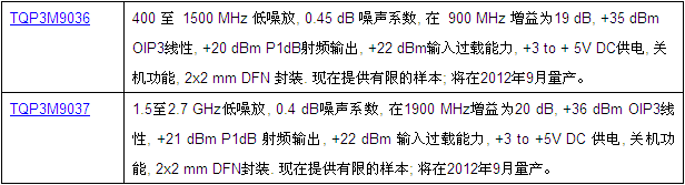 目前供應(yīng)TQP3M9036和TQP3M9037的初始樣品,預(yù)計(jì)將于2012年9月開始量產(chǎn)。
