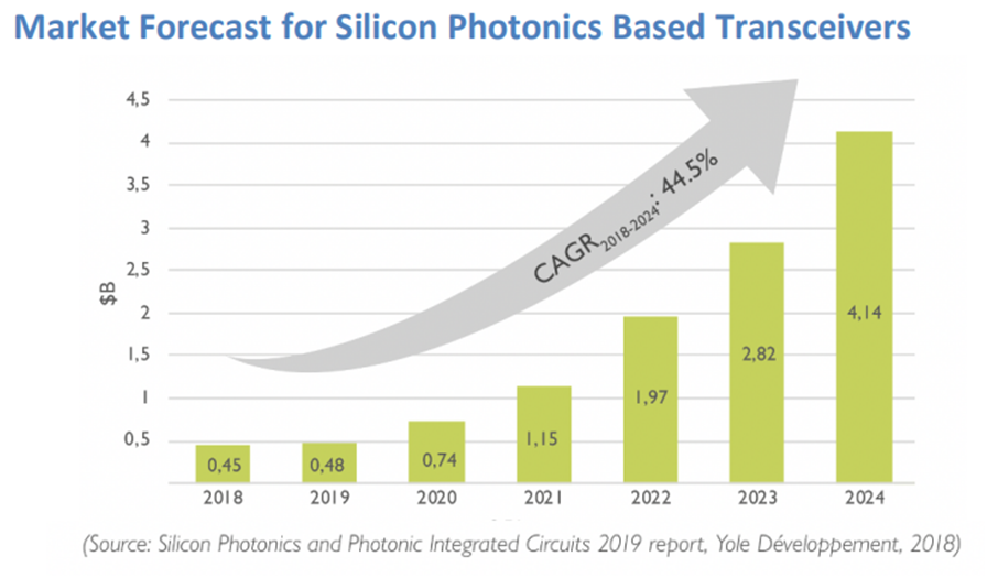 據(jù)行業(yè)預(yù)測,至2024年,光模塊的市場總額達(dá)到160億美元,其中數(shù)據(jù)通信光模塊的營收將達(dá)到120億美元。業(yè)界之所以對硅光倍加關(guān)注,硅光在未來數(shù)通市場的重要性不言而喻。