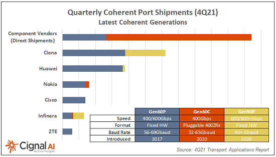 800G相干端口的最大供應商,盡管Infinera和ICE6產(chǎn)品出貨量正在迅速增長。