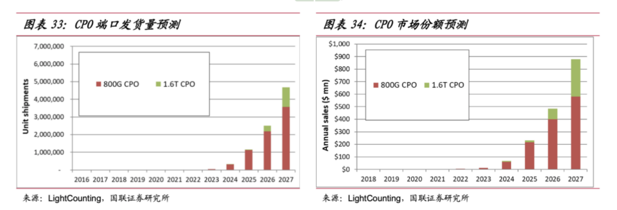 LightCounting預(yù)測(cè),按照端口數(shù)量統(tǒng)計(jì),2026年,HPC和AI簇預(yù)計(jì)成為CPO光器件最大的市場(chǎng),出貨預(yù)計(jì)將從800G和1.6T端口開始,于2024至2025年開始商用,整體發(fā)貨量將從2023年的5萬件增加到2027年的450萬件,4年大增約90倍。