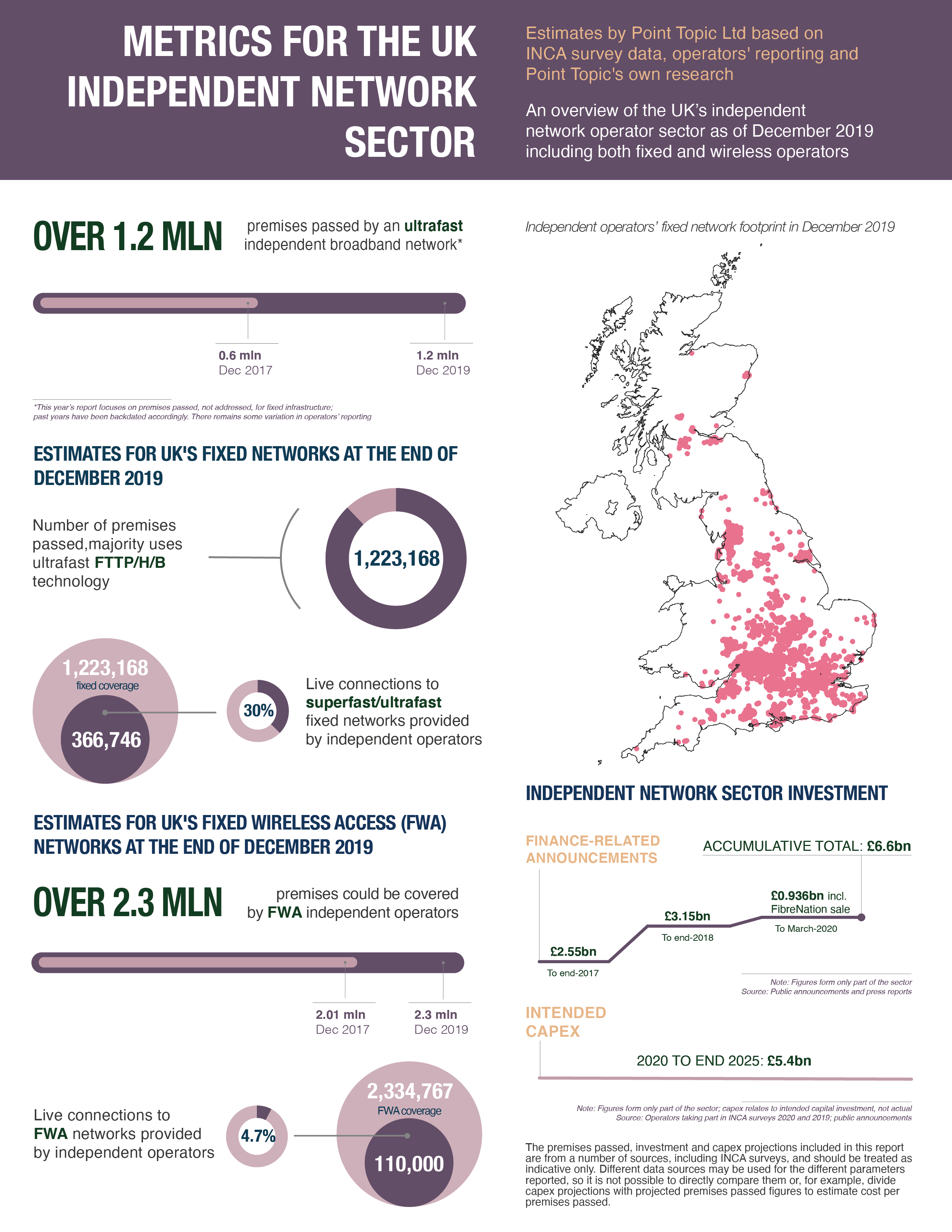 ICC訊(編譯:Vicki)Point Topic為INCA編寫(xiě)了一份報(bào)告,概述了截至2019年底和2020年初英國(guó)的獨(dú)立網(wǎng)絡(luò)運(yùn)營(yíng)商部門(mén)。該報(bào)告包括固定和固定無(wú)線網(wǎng)絡(luò)運(yùn)營(yíng)商。 但是,今年P(guān)oint Topic改變了方法,不再包括用于固定基礎(chǔ)設(shè)施的“可尋址場(chǎng)所”,而只關(guān)注“通過(guò)的場(chǎng)所”。 這意味著我們對(duì)前幾年的數(shù)字進(jìn)行了修改,從而使我們認(rèn)為對(duì)市場(chǎng)的看法更為準(zhǔn)確。