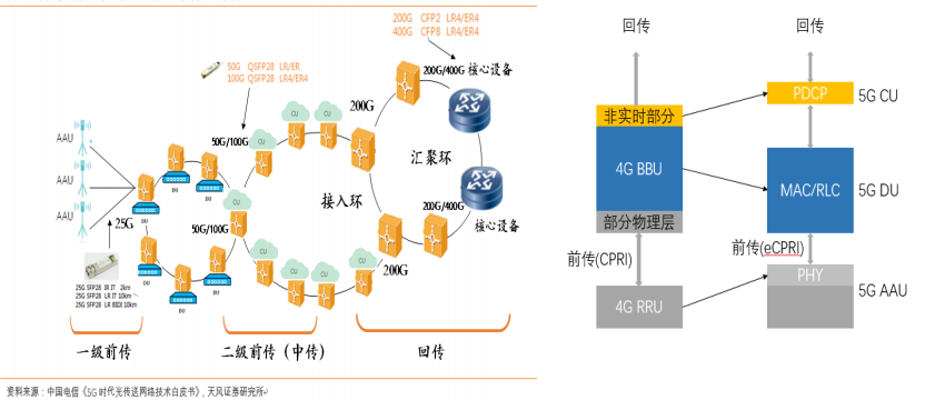 5G網(wǎng)絡(luò)所提供的多類業(yè)務(wù)的主要特征包括大帶寬、低延時(shí)、海量連接等從而對承載網(wǎng)提出了大寬帶、低延時(shí)、高精度時(shí)間同步、靈活組網(wǎng)、網(wǎng)絡(luò)切片的要求。5G承載網(wǎng)將從4G時(shí)期的兩級結(jié)構(gòu)演化到三級結(jié)構(gòu),衍生出前傳、中傳和回傳網(wǎng)絡(luò)三部分。同時(shí),5G網(wǎng)絡(luò)頻譜相對4G網(wǎng)絡(luò)更高,造成基站密度大幅增加。由此衍生,5G網(wǎng)絡(luò)的建設(shè)相較4G時(shí)代提升了對光模塊產(chǎn)品的數(shù)量需求、速率要求,要求的傳輸距離也會越來越遠(yuǎn)。目前5G前傳網(wǎng)絡(luò)以25G光模塊產(chǎn)品為主;中傳或以50G PAM4為主;5G回傳或?qū)⑹褂?00G/200G/400G相干光模塊(高速長距)。據(jù)公開資料及中信建投證券研究報(bào)告預(yù)計(jì),中國5G光模塊市場規(guī)模預(yù)計(jì)將達(dá)到550億元,較4G時(shí)代180億元投資額增長206%。