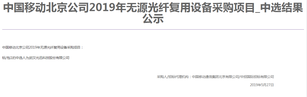 ICCSZ訊 (編輯:Nicole)中國(guó)移動(dòng)北京公司2019年無(wú)源光纖復(fù)用設(shè)備采購(gòu)項(xiàng)目中選結(jié)果出爐,由武漢光迅科技股份有限公司獨(dú)家中標(biāo)。
