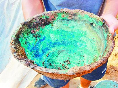 一鏟、一鏟,經(jīng)過考古人員細(xì)心挖掘,一個青銅質(zhì)地的臉盆出現(xiàn)在人們的視線中。令考古人員吃驚的是,這個直徑20厘米的青銅盆居然是一個彩繪青銅器皿。經(jīng)過考古人員的初步清理,記者看到,青銅彩繪器皿中,有一條青龍繪畫在盆壁上,龍的身形好似正在騰飛,龍頭和龍須線條分明。