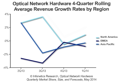 * 全球光網(wǎng)絡(luò)設(shè)備支出在傳統(tǒng)SONET/SDH開支下滑的情況下,持續(xù)下降:2014年第一季度,全球光網(wǎng)絡(luò)設(shè)備銷售收入,包括WDM和SONET/SDH,同比下降2%;