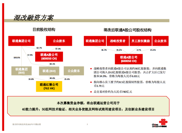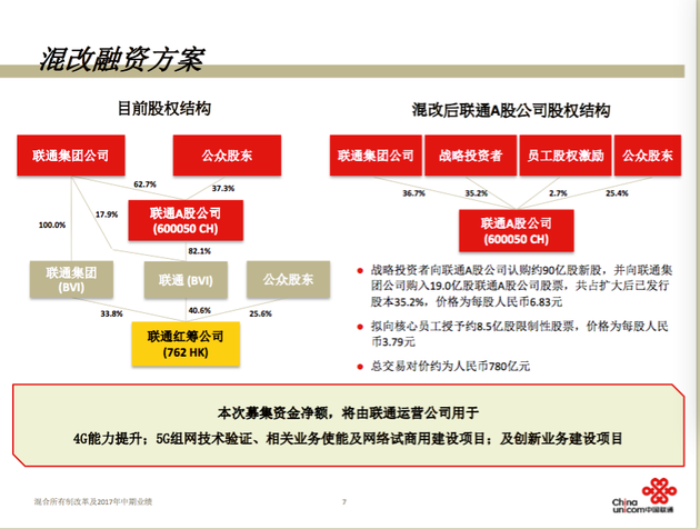 當天早些時候,聯(lián)通香港官網發(fā)布的公告里稱,“戰(zhàn)略投資者向聯(lián)通A股公司認購約90億股新股,并向聯(lián)通集團公司購入19.0億股聯(lián)通A股公司股票,共占擴大后已發(fā)行股本34.9% ,價格為每股人民幣6.83元”,隨后的版本中,“34.9%”已修改為“35.2%”;但兩個版本中的“混改后聯(lián)通A股公司股權結構 ”圖中,戰(zhàn)略投資者顯示的占股比例均為35.2%。